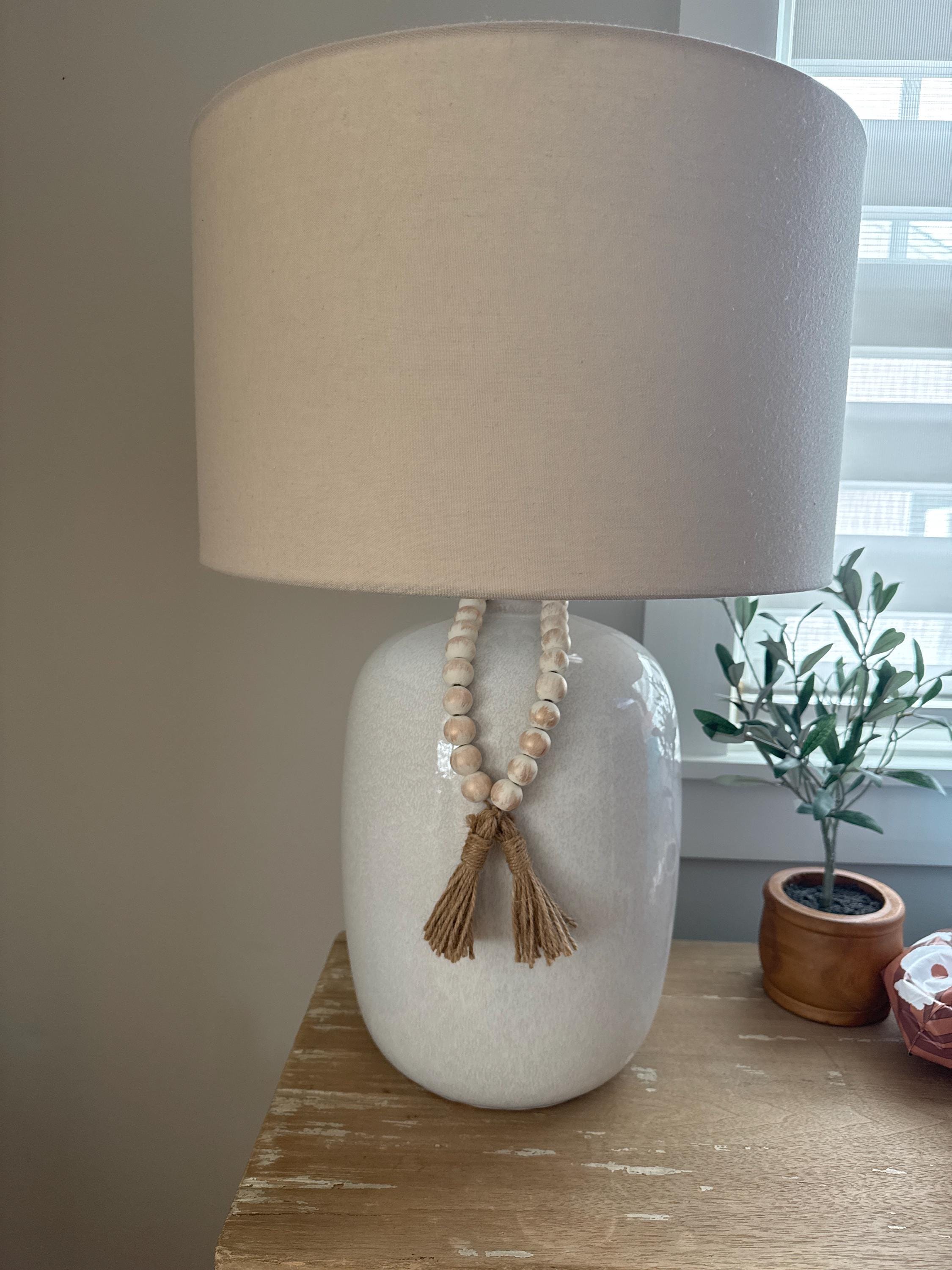 White and bronze wood bead garland, jute tassels, beach home decor, rustic bead garland, farmhouse beads