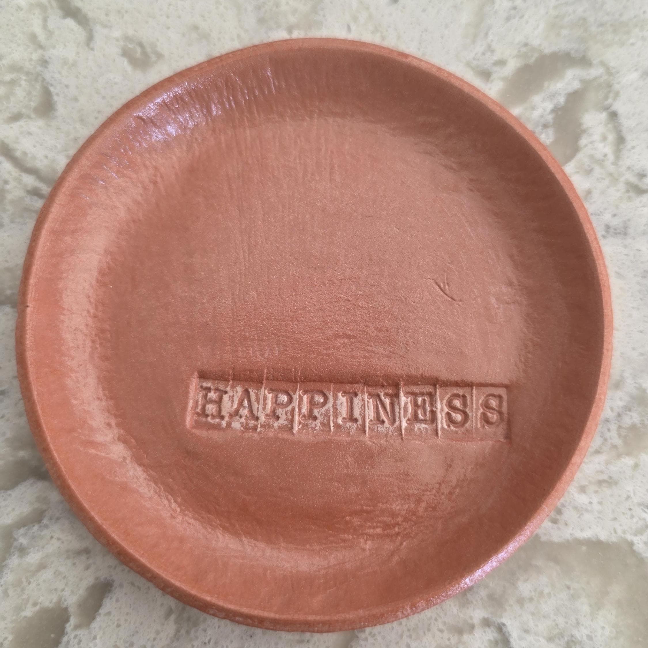 A simple jewelry dish made with high quality terra cotta air dry clay that has been hand stamped with a cute design. Display this dish on your dresser or nightstand to hold your jewelry.